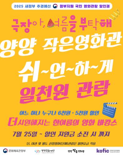 [뉴스스텝] (재)양양문화재단은 문화체육관광부와 영화진흥위원회에서 추진하는 '2025 국민 영화관람 활성화 지원사업'에 지원하여 참여 영화관으로 선정됐다.