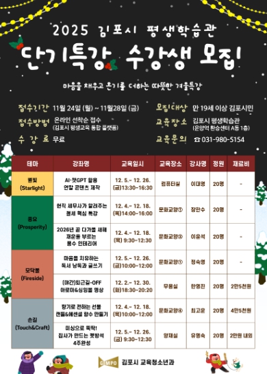 [뉴스스텝] 김포시는 ‘따뜻한 연말’을 주제로 시민의 정서적 힐링과 실생활에 유용한 학습 기회 제공을 위해, ‘2025년 하반기 평생학습관 단기특강 수강생’을 오는 11월 24일부터 선착순으로 모집한다.