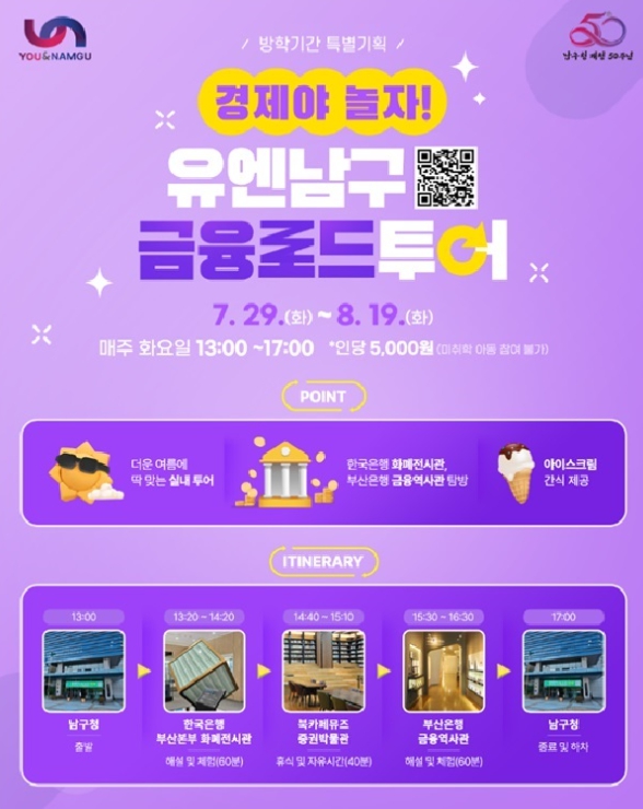 [뉴스스텝] 부산광역시 남구는 여름방학을 맞아 어린이와 청소년을 위한 금융 체험형 테마 투어 '경제야 놀자! 유엔남구 금융 로드투어'를 오는 7월 29일부터 8월 19일까지 매주 화요일 운영한다고 밝혔다.