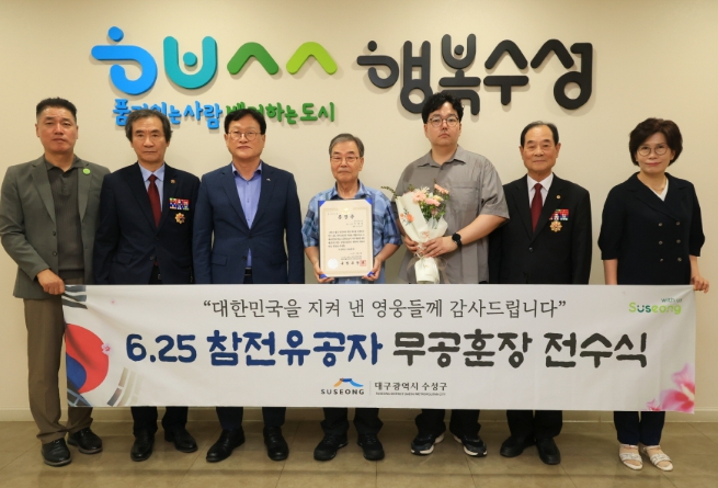 [뉴스스텝] 대구 수성구는 지난 14일 6·25 전쟁에 참전해 공을 세운 고(故) 전제일 상병의 유가족에게 화랑무공훈장과 증서를 전수했다.