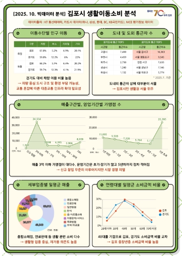 이를 통해 김포시의 차량 중심 도시구조, 서울 위주의 생활권, 중장년층 중심의 소비 특성 등을 확인할 수 있었다. 시는 이번 분석 결과를 교통 인프라 개선, 소상공인 지원, 연령대별 맞춤형 경제정책 수립 등의 기초자료로 삼을 예정이다.