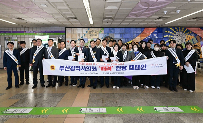 ‘우리 사회의 많은 갈등과 불편은 작은 배려가 부족해서 생겨납니다’라는 슬로건 아래, 부산시의회는 교통·안전·타인·장애인 등 일상 속 배려문화 확산을 목표로 캠페인을 전개했다. 이날 현장에서는 시의원과 의회사무처 직원들이 시민들을 대상으로 홍보 피켓, 어깨띠, 안내 리플릿 등을 활용한 캠페인을 실시,
