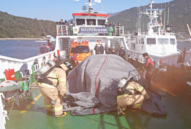이에 남해지방해양경찰청은 운항 중인 차도선 내 전기차에서 화재가 발생한 상황을 가정하여 승객 탈출 및 인명구조 활동은 물론, 하부관창과 질식소화덮개 등 전용 장비를 활용한 초기 화재 진압, 긴급 피항 이후 소방과 연계된 완전 진화 활동까지 실전 중심의 현장 기동훈련을 진행했다.