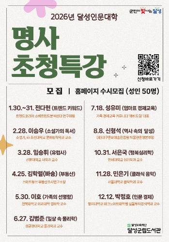 [뉴스스텝] 대구 달성군립도서관은 2026년 한 해 동안 지역 주민들을 위한 ‘명사초청특강’을 진행한다고 8일 밝혔다.
