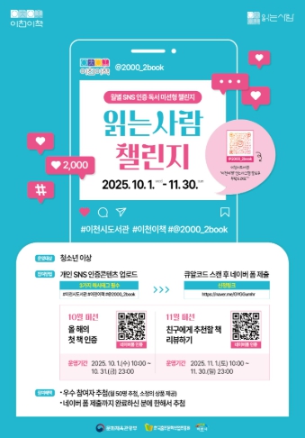 참여자는 개인 사회관계망(SNS)인 인스타그램, 블로그 등에 주어진 독서 미션을 완료하고 지정된 해시태그 3개(#이천시도서관 #이천이책 #@2000_2book)를 포함한 인증글을 게시한 뒤 네이버폼을 통해 참여 내용을 제출하면 된다. 이천시는 매월 50명의 우수 참여자를 추첨해 소정의 상품도 제공할 계획이다.