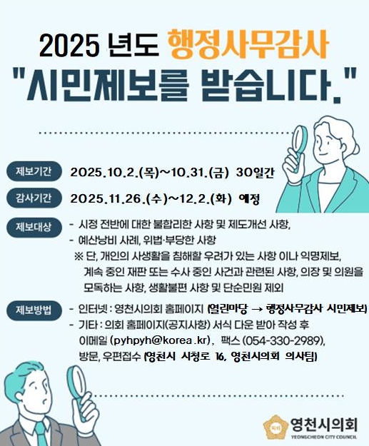 [뉴스스텝] 영천시의회는 2025년도 행정사무감사를 앞두고 10월 31일까지 시민제보를 받는다.