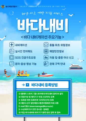 [뉴스스텝] 울진해양경찰서는 여름철 수상레저 활동이 활발해지는 시기를 맞아, 수상레저 사고 예방을 위한 ‘바다내비’ 앱 등록 및 사용을 적극 권고하고, 관내 주요 항포구·파출소 등을 중심으로 홍보 포스터를 배포하며 본격적인 대국민 홍보에 나섰다.