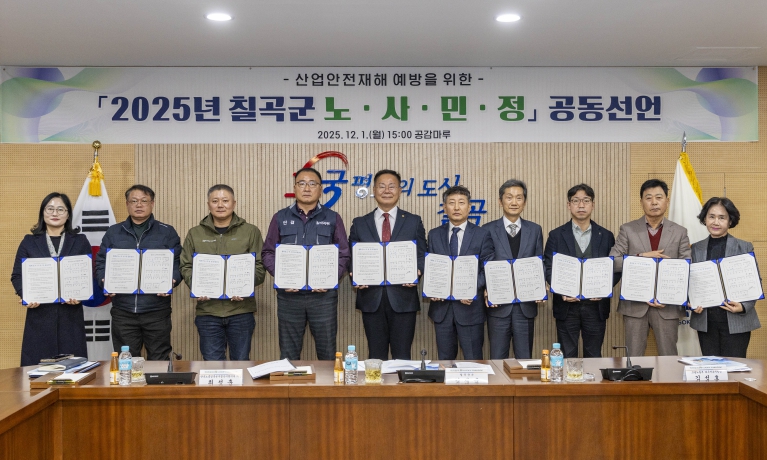 [뉴스스텝] 칠곡군은 12월 1일 군청 공감마루에서 2025년 칠곡군 노사민정협의회를 개최하고, 산업안전재해 예방을 위한 노사민정 공동선언문에 서명했다.