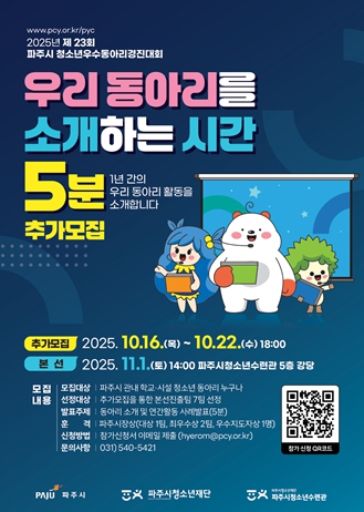 [뉴스스텝] (재)파주시청소년재단 파주시청소년수련관은 오는 10월 16일부터 10월 22일까지 “제23회 파주시 청소년우수동아리경진대회”의 참가 동아리를 모집한다.