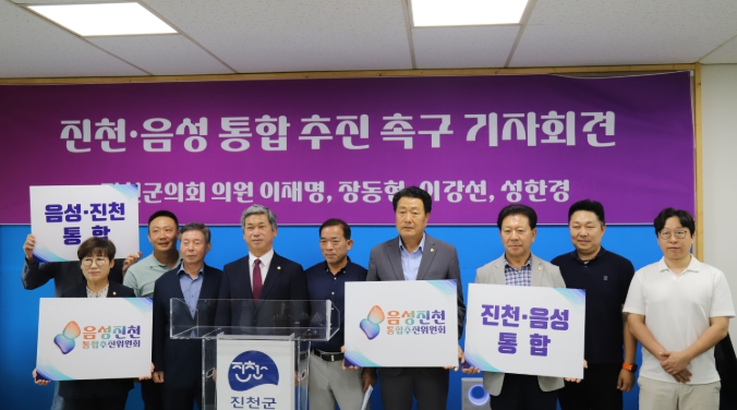 [뉴스스텝] 진천군의회 이재명, 이강선, 장동현, 성한경 의원은 7월 7일 진천군청 브리핑실에서 긴급 기자회견을 열고 진천군과 음성군의 통합 추진에 대해 찬성 입장을 밝히며 집행부의 적극 대응을 촉구했다.