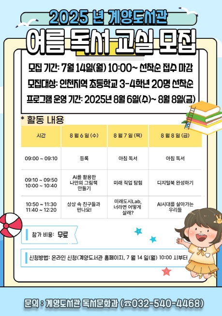 [뉴스스텝] 인천광역시교육청계양도서관은 8월 6일부터 8일까지 3일간, 초등학교 3~4학년을 대상으로 ‘2025 여름독서교실’을 운영한다.