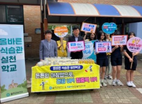 이날 캠페인 참가자들은 ‘든든한 아침밥으로, 건강 UP! 집중력 UP!’을 슬로건으로, 등교하는 학생들에게 간단한 아침밥 대용 간식을 나눠주며 아침식사의 중요성을 알렸다.