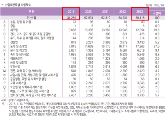 | ▲ 산업대분류별 사업체수 표. 김포시는 2019년 대비 기업체수가 92.9% 증가했다. |
