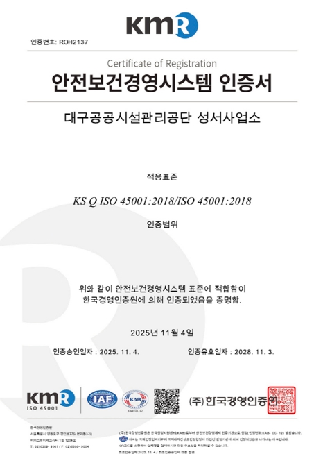 [뉴스스텝] 대구공공시설관리공단 성서사업소는 11월 4일, 한국경영인증원이 실시한 안전보건경영시스템 국제표준(ISO45001) 인증 심사에서 ‘적합’ 판정을 받았다.