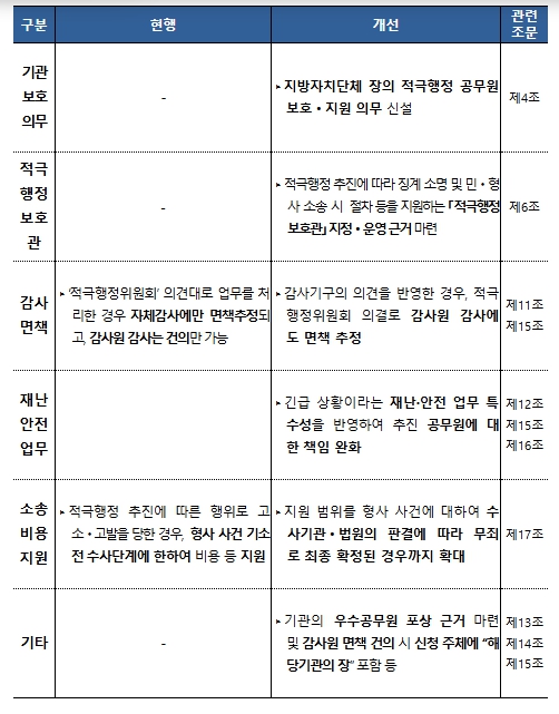 적극행정 추진으로 징계 소명 및 민·형사상 소송이 진행되는 경우 소속기관 차원의 보호·지원이 의무화되고, 적극행정 보호관을 지정해 공무원을 보호해야 한다.
