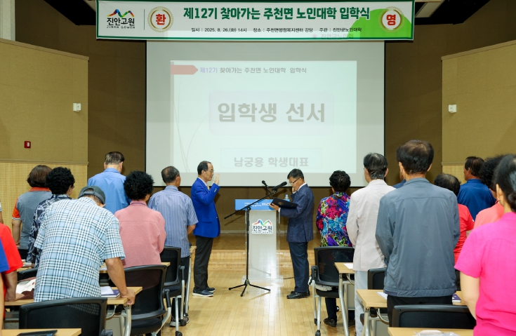 한편, 진안군 찾아가는 노인대학은 문화·교육에서 소외되기 쉬운 읍·면 지역 어르신들에게 학습의 기회를 제공하고 여가 활동을 지원하는 프로그램으로, 주 2회 총 12회 과정이 운영된다. 주천면 노인대학은 이번 입학식을 시작으로 오는 11월까지 문화·예술·건강관리·교양 등 다채로운 강좌를 진행할 예정이다.