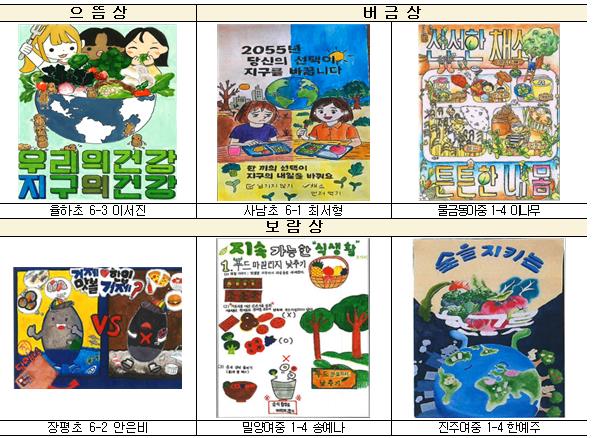 보람상은 ▲지역 식재료의 의미를 담은 장평초 안은비, ▲지속 가능한 식생활의 중요성을 그린 밀양여중 송예나, ▲숲을 지키는 채식의 의미를 담은 진주여중 한예주 학생이 각각 수상했다.