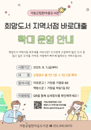 [뉴스스텝] 거창군은 오는 8월 1일부터 ‘희망도서 지역서점 바로대출 서비스’의 월 도서 신청 권수를 기존 1인 1권에서 2권으로 확대 운영한다.