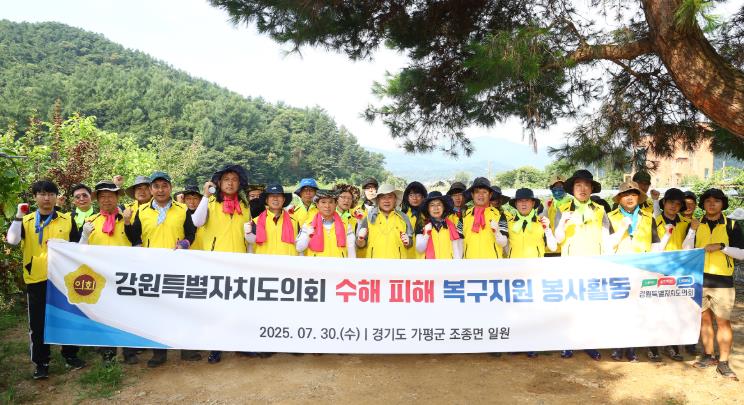 김시성 의장을 비롯하여 김용복 부의장, 이한영, 원제용, 엄윤순, 박찬흥, 정재웅, 최규만, 이영욱 도의원과 의회사무처 직원 30여 명은 7월 30일 가평군 조종면 일대를 찾아 수해피해 복구 지원을 위한 자원 봉사활동을 펼치며, 피해 농가의 신속한 복구를 도왔다.