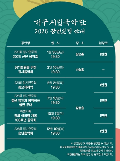 [뉴스스텝] 대구시립국악단은 전통문화예술을 활성화하고 시민들에게 보다 폭넓은 문화 혜택을 제공하고자 2026년 연간 정기회원을 모집한다.