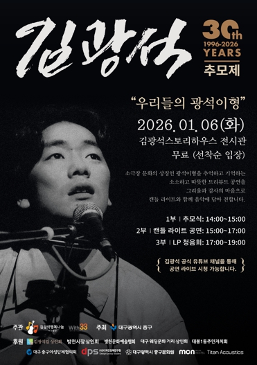 류규하 중구청장은 “김광석 30주기는 그의 음악이 세대와 시간을 넘어 지금도 많은 이들의 마음에 닿아 있음을 돌아보는 자리”라며 “앞으로도 김광석의 음악적 가치와 예술정신이 문화 콘텐츠로 이어질 수 있도록 노력하겠다”고 말했다.
