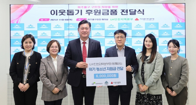 [뉴스스텝] 인천 미추홀구는 6일 구청장실에서 한국토지주택공사(LH) 인천지역본부(본부장 서환식)로부터 아동복지시설 지원을 위한 온누리상품권 600만 원을 전달받았다.