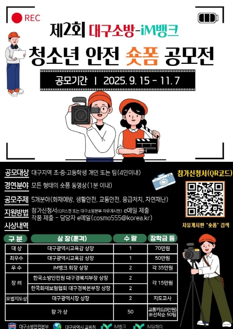 [뉴스스텝] 대구소방본부와 대구광역시교육청이 주최하고 iM뱅크, iM유페이가 후원하는 ‘제2회 대구소방-iM뱅크 청소년 안전 숏폼 공모전’이 오는 11월 7일까지 열린다.