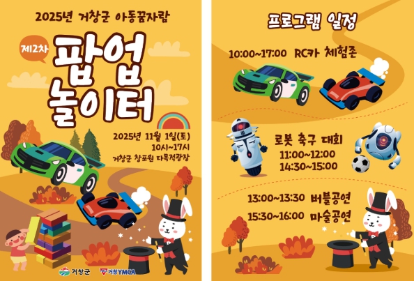 [뉴스스텝] 거창군은 오는 11월 1일, 오전 10시부터 오후 5시까지 남상면 창포원에서 ‘아동꿈자람 팝업놀이터’ 행사를 운영할 예정이다. 이번 행사는 지난 7월 수승대 잔디광장에서 열린 행사에 이어 두 번째로 마련된 것으로, 거창군 국화축제 기간 중 열리며 아이들이 자유롭고 안전하게 즐길 수 있는 체험형 놀이공간을 제공한다.