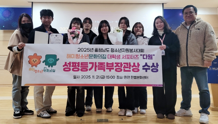 [뉴스스텝] 해미청소년문화의집은 지난 21일 성평등가족부와 충청남도가 주최한 2025년 충남청소년자원봉사대회에서 대학생 서포터즈 ‘다원’이 동아리 부문에서 성평등가족부장관상을 수상했다고 밝혔다.