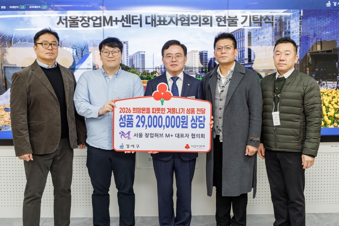 ▲ 진교훈 서울 강서구청장(가운데)이 구청장실에서 서울창업허브 엠플러스 대표자협의회로부터 이웃돕기 성품을 전달받고 기념촬영을 하고 있다. 왼쪽부터 백종진 수석부회장, 성인성 그리니쉬 대표, 진교훈 구청장, 김범수 회장, 최승호 부회장