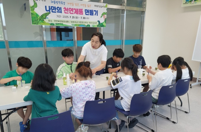 [뉴스스텝] 전남 무안군 드림스타트는 여름방학을 맞아 지난 21일부터 2주간 월요일에는 무안군 복합문화센터에서, 수요일은 남악회룡주공아파트 ‘아낌없이 주는 작은도서관’ 프로그램실에서 총 4회에 걸쳐 나만의 천연제품 만들기 프로그램을 운영했다.