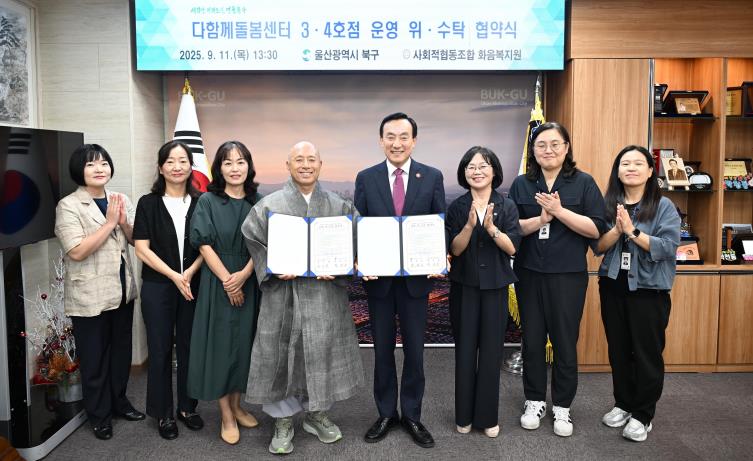 [뉴스스텝] 울산 북구는 11일 구청장실에서 사회적협동조합 화음복지원과 다함께돌봄센터 3·4호점 운영 위·수탁 협약을 체결했다.
