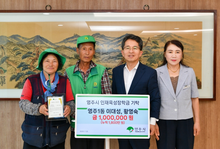 [뉴스스텝] (재)영주시인재육성장학회(이사장 김자여)는 7월 25일, 영주1동 새마을지도자인 이대성·황영숙 부부와 ㈜칠공사로부터 각각 100만 원과 200만 원의 인재육성 장학금을 기탁받았다고 밝혔다.