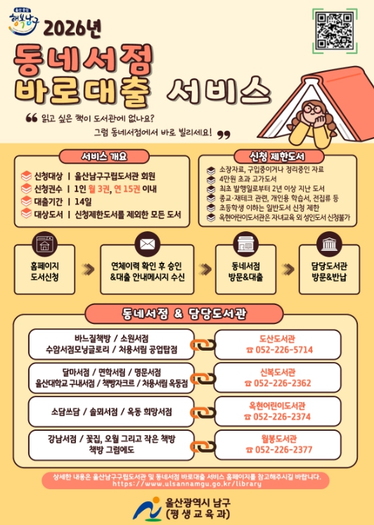 [뉴스스텝] 울산 남구는 2026년 ‘동네서점 바로대출’서비스를 2일부터 운영한다.
