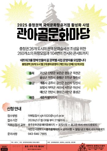 [뉴스스텝] 충주문화관광재단과 충주시는 정부의 지방시대 핵심 비전인 ‘5극 3특(5대 초광역권 및 3대 특별자치도)’ 전략에 발맞춰, 충청권역의 문화적 연대를 강화하고 지역 균형 성장을 견인할 '충청권 국악문화향유거점 활성화 사업' 운영자를 오는 21일까지 공개 모집한다.