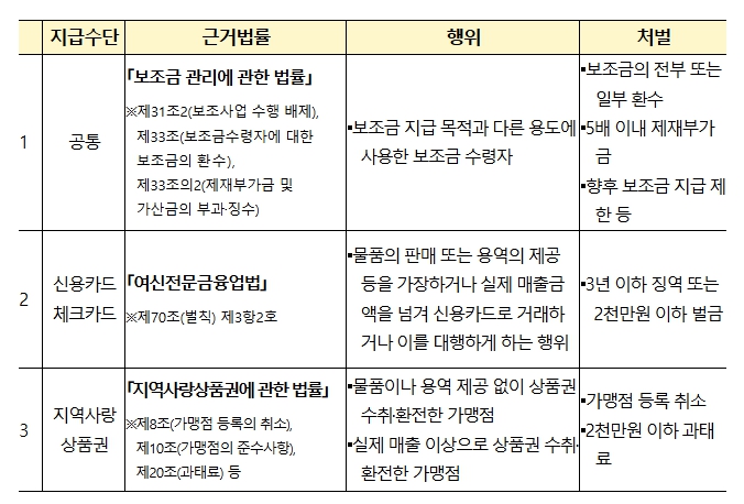 또한 지방자치단체에는 지역별 ‘부정유통 신고센터’를 운영해 가맹점 수시단속과 함께 온라인 커뮤니티 등에서 개인 간 거래가 발생하지 않도록 모니터링을 강화해 줄 것을 요청했다.