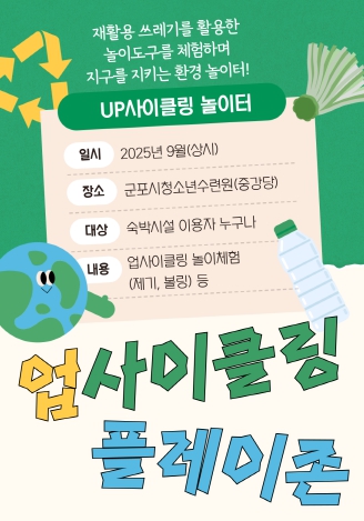 업사이클링은 버려지는 플라스틱 쓰레기를 재활용 차원을 넘어 친환경 기술, 아이디어 등 가치를 부가하여 새로운 제품을 탄생시키는 것을 말하는데, ‘업사이클링 플레이존‘은 재활용 쓰레기를 활용한 놀이 체험으로 폐현수막과 폐페트병을 활용한 ’업사이클링 놀이도구‘를 이용한 체험활동을 말한다.