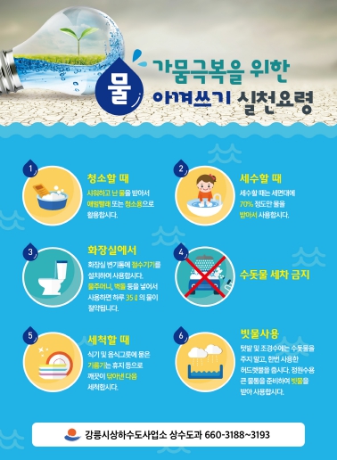 이에 강릉시는 폭염, 강수 부족, 휴가철과 맞물려 생활용수 및 농업용수 공급 부족 상황에 대비하여 지속적인 모니터링을 실시하고 있으며, 물 절약 홍보를 위해 시청 전 부서에서 출퇴근길 홍보 캠페인 실시, 사회관계망서비스(SNS) 홍보 및 TV방송 자막 송출 등 캠페인 홍보에 총력을 다하고 있다.