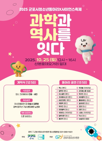 [뉴스스텝] (재)군포시청소년재단 산하 군포시청소년수련관은 오는 10월 25일 12시부터 16시까지 산본로데오거리 일대에서 2025 군포시청소년동아리X사이언스축제 ‘과학과 역사를 잇다’를 펼친다. 청소년들에게 공연과 과학, 역사 체험의 기회를 제공하고 지역사회의 참여를 끌어내겠다는 취지이다.