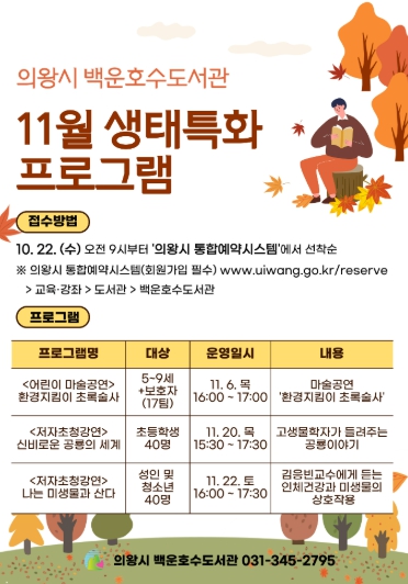 [뉴스스텝] 의왕시 백운호수도서관은 지역 주민들에게 자연과 생태의 소중함을 알리고 책을 통해 환경 감수성을 높이기 위해 '11월 생태특화 프로그램'을 운영한다고 밝혔다.