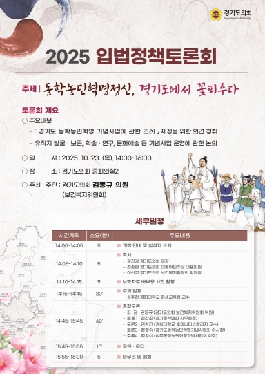 [뉴스스텝] 경기도의회 김동규 의원(더불어민주당, 안산1)은 오는 10월 23일 오후 2시, 경기도의회 중회의실2에서 '동학농민혁명정신, 경기도에서 꽃피우다' 입법정책토론회를 개최한다고 밝혔다.