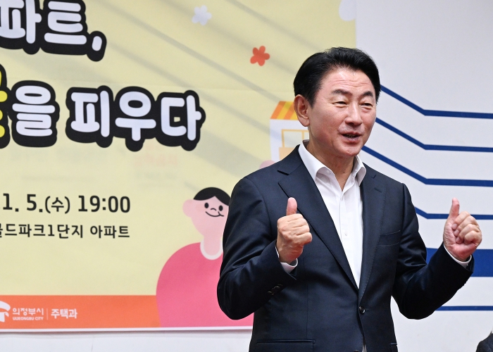 | ▲ 김동근 시장이 11월 5일 롯데캐슬골드파크1단지 아파트에서 ‘2025년 찾아가는 U아파트 상담실_아파트, 사람꽃을 피우다’ 간담회를 진행하고 있다. |