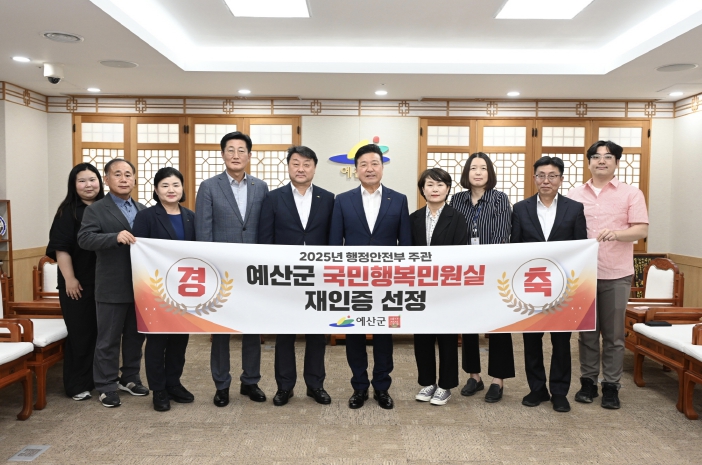 [뉴스스텝] 예산군은 행정안전부가 주관하는 ‘2025년 국민행복민원실’ 평가를 통과해 재인증 기관으로 선정됐다고 17일 밝혔다.