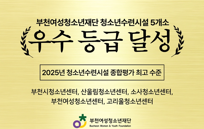 [뉴스스텝] 부천여성청소년재단이 청소년수련시설 5개소(부천시청소년센터, 산울림청소년센터, 소사청소년센터, 부천여성청소년센터, 고리울청소년센터)가 성평등가족부 주관 2025년 청소년수련시설 종합평가에서 5개 시설 모두 최고 수준인 ‘우수’ 등급을 달성하는 쾌거를 이루었다.