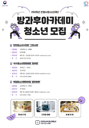 [뉴스스텝] 안양시청소년재단은 공공 청소년 돌봄 사업인 청소년방과후아카데미의 2026년도 참여 청소년을 모집한다.