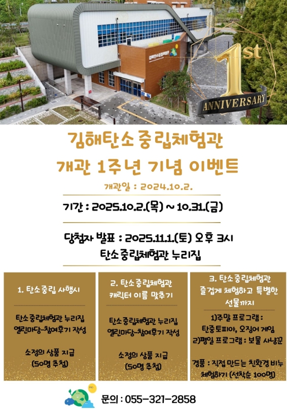 [뉴스스텝] 김해시는 김해탄소중립체험관 개관 1주년을 맞아 2일부터 31일까지 한 달간 특별 기념 이벤트를 운영한다. 이번 이벤트는 온라인과 오프라인 어디든 자유롭게 참여할 수 있다.