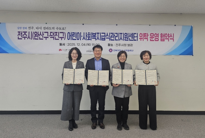 [뉴스스텝] 전주시는 4일 전주대학교 산학협력단, 전북대학교 산학협력단과 각각 ‘전주시 어린이·사회복지급식관리지원센터 위탁운영 협약’을 체결했다.