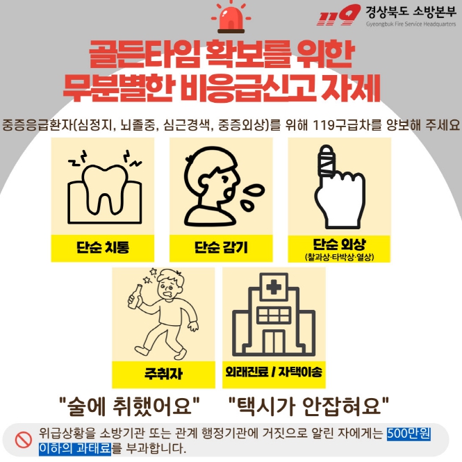 [뉴스스텝] 경상북도소방본부는 겨울철에 심정지·호흡기 질환·낙상 등 중증 응급환자가 평소보다 증가하는 상황에서 감기·경미 통증·주취자 등 비응급 신고가 늘고 있어, 119 비응급 신고 자제가 절실하다고 밝혔다.