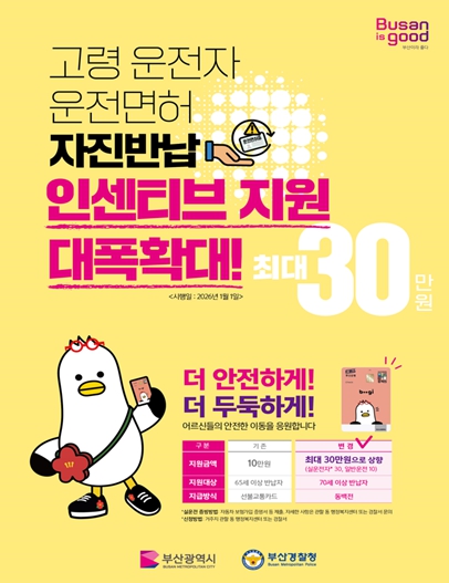 [고령자 운전면허 자진반납 제도개선] 2018년부터 시행 중인 고령자 운전면허 자진반납 우대제도의 실효성을 높이고, 사고발생률과 치사율이 높은 후기 연령층에 집중하고자 ▲지원 대상 나이를 기존 65세 이상에서 70세 이상으로 상향 조정한다. 또한, ▲운전면허 반납 시 지급하던 선불교통카드는 지역경제 활성화를 위해 동백전(정책지원금)으로 변경하고, ▲지원금액은 자동차 보험가입증명서, 자동차등록증 등 실제 운전자임을 증빙하는 서류를 제출하는 경우에는 30만 원을, 기존처럼 운전면허증만 반납하는 경우에는 10만 원을 지원한다. 개선된 고령자 운전면허 자진반납 제도는 1월 1일부터 바로 시행된다.