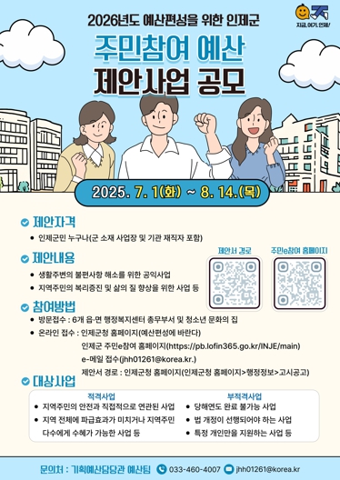 참여는 인제군민 누구나 가능하며, 제안서를 작성해 읍·면 행정복지센터 총무팀에 방문 제출하거나, 인제군청 홈페이지를 통해 신청하면 된다. 특히 올해는 ‘주민참여예산시스템(주민e참여)’을 통해 온라인 접수 창구를 확대하고, 청소년 분야 제안을 신설하여, 미래 세대인 청소년의 군정 정책 참여 기회를 제공한다.